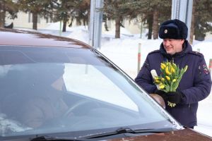 Юл хәрәкәте иминлеге дәүләт инспекциясе хезмәткәрләре Актаныш районының машина йөртүче гүзәл затларын 8 Март белән котлады
